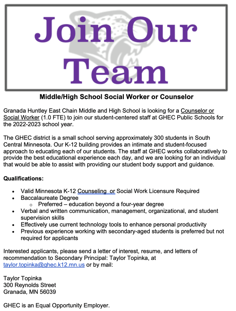 Please join me in recognizing our GHEC MS/HS School Counselor, Mrs. McGregor, in celebration of National School Counselor Week. Being a school counselor is just one of the many roles Mrs. McGregor takes on at GHEC School. She has been a very positive addition to our GHEC school community. Her ability to provide emotional, behavioral, and academic guidance is critical to the success of many students (and their families) we serve. Please take a moment to stop by Mrs. McGregor’s office or send her a note of appreciation to recognize how much she means to our students, staff, and extended GHEC school family. Thank you for your hard work and dedication!